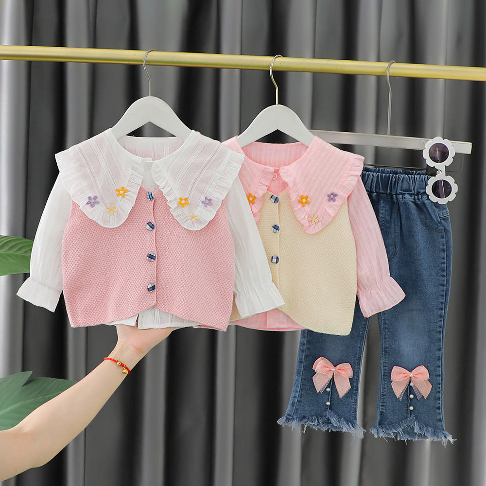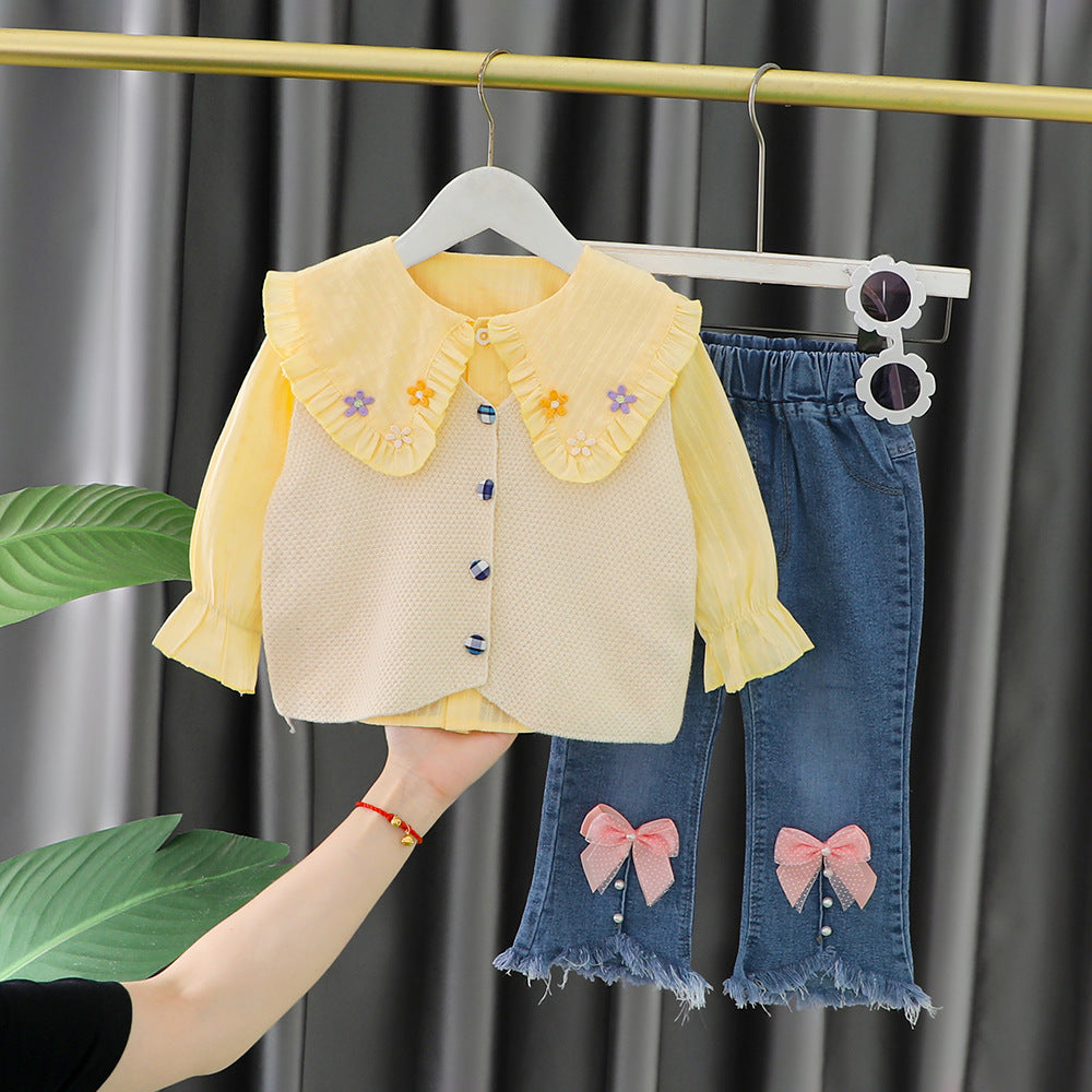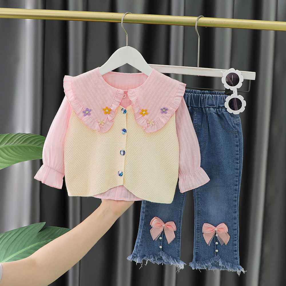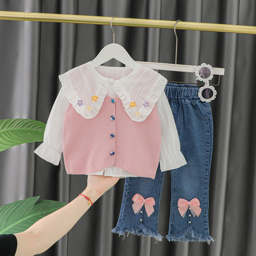 👖 سروال جينز مزين بفيونكات لامعة وخرز صغير لمظهر جميل ومرح.